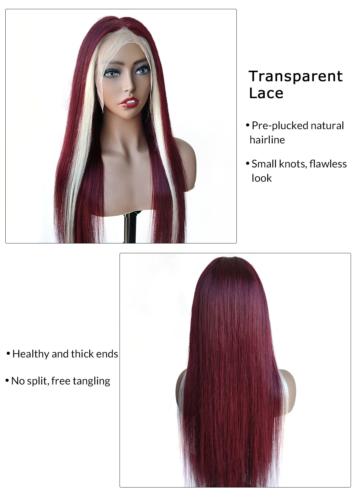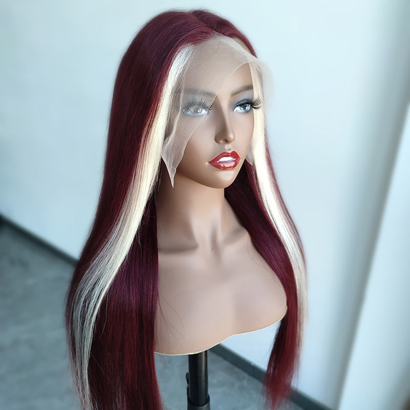 Red Wine & Blonde Skunk Stripe Color Wig 13*4 Lace Front Wig, Can be restyled, Picture is restyled look, Medium size cap with adjustable strap, 100% human hair pre plucked natural hairline. One week processing time before Shipment.